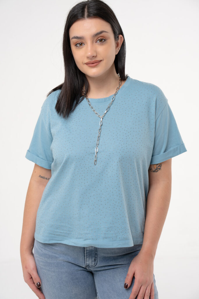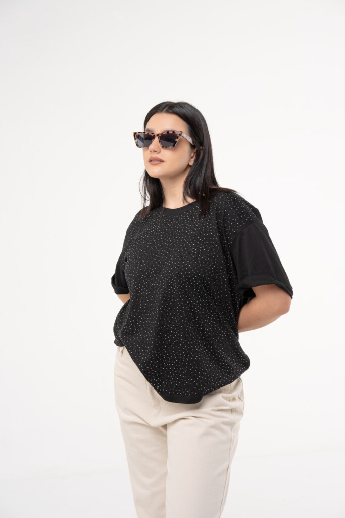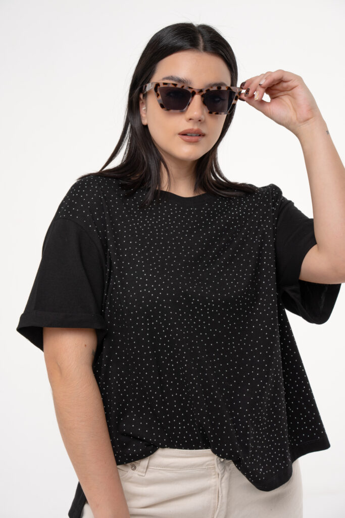 Su diseño clásico de escote redondo a la base y mangas con doble ruedo se eleva gracias al transfer de strass en toda la superficie, que aporta brillo sutil y un aire moderno. Ideal para usar tanto en looks casuales como para dar un plus de sofisticación en la noche.